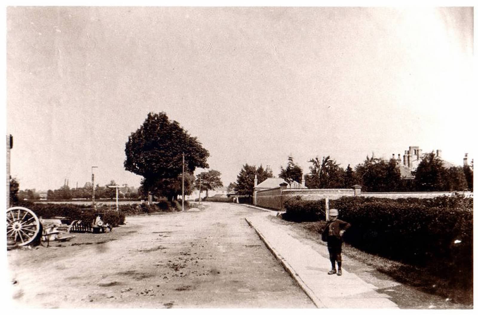 View down Akeferry road from the cross roads. Note rail bridge over the road.
