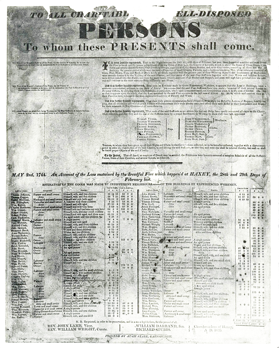 Haxey Fire Poster. 1744. Reprinted 1844