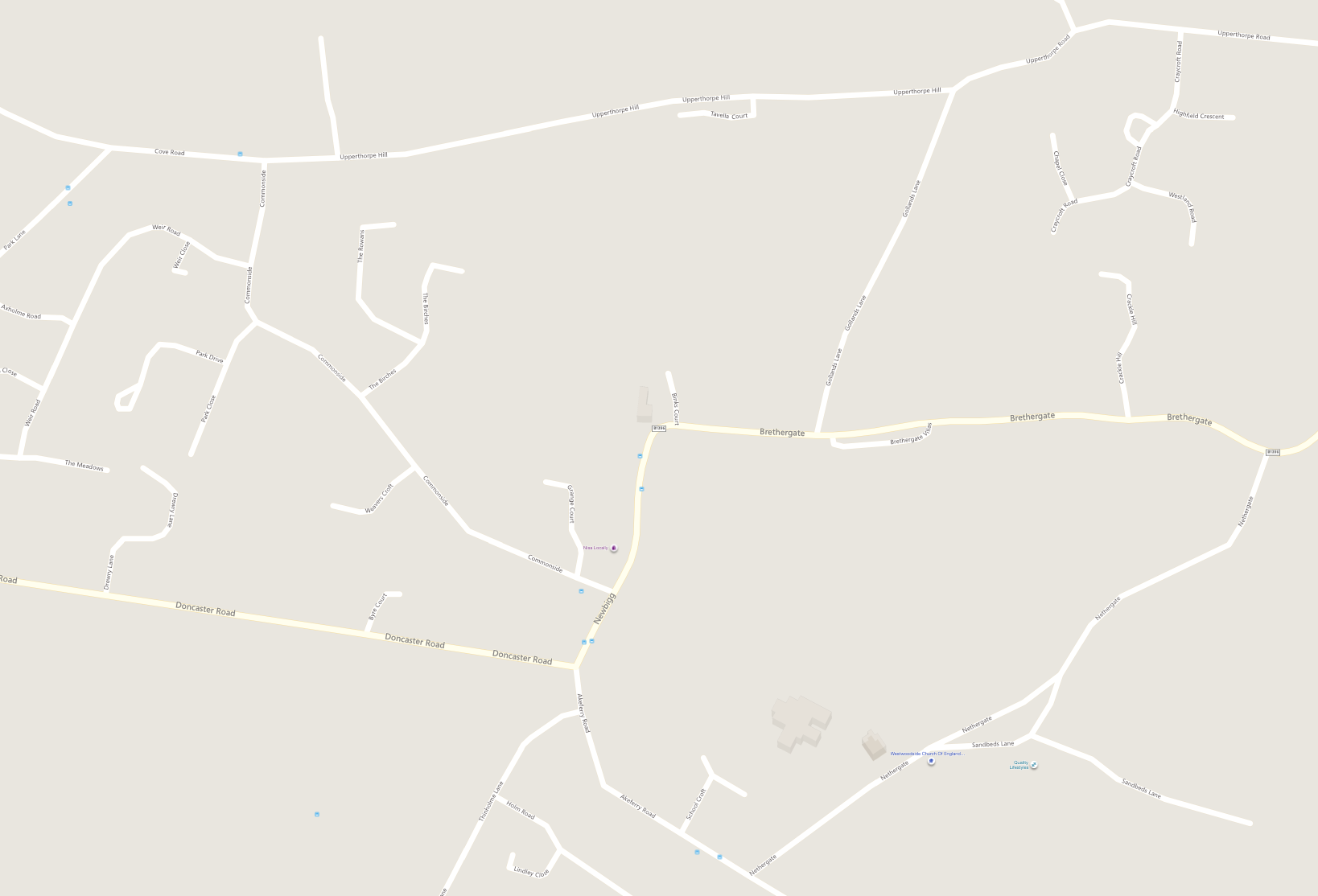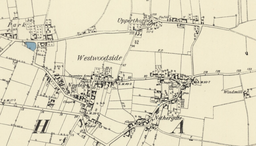 You can see that most of the photos refer to parts of the village. This is because Westwoodside is a combination of the historical hamlets of Park, Newbigg, Nethergate, Upperthorpe and Commonside. These names persist, as you can see on a modern road map of the area (courtesy of Bing maps) but were once very clearly delineated as you can see on the old Ordinance Survey map of about 1880.